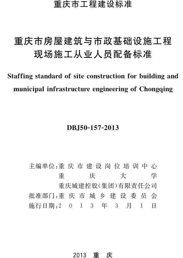 《重慶市房屋建筑與市政基礎設施工程現場施工從業(yè)人員配備標準》(DBJ50-157-2013)【全文為PDF版下載】
