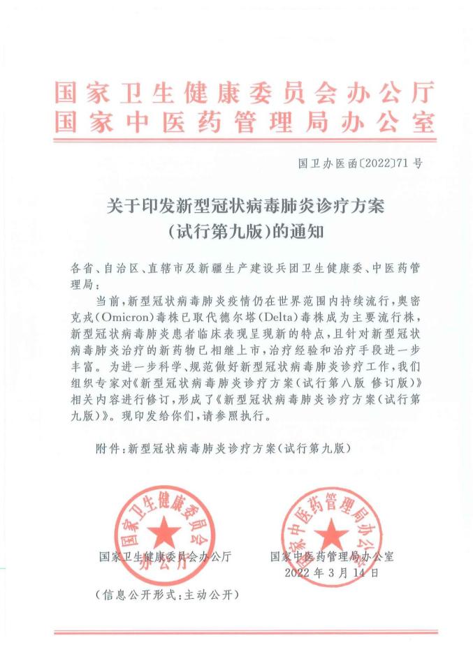 國(guó)衛(wèi)辦醫(yī)函〔2022〕71號(hào)《國(guó)家衛(wèi)生健康委員會(huì)辦公廳國(guó)家中醫(yī)藥管理局辦公室關(guān)于印發(fā)新型冠狀病毒肺炎診療方案(試行第九版)的通知》