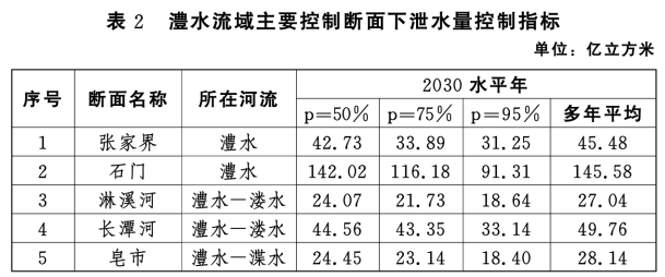 多年平均及不同來水頻率下澧水流域主要斷面下泄水量控制指標見表2。