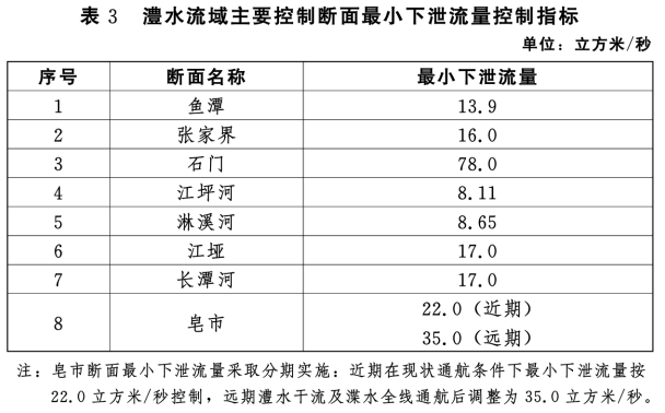 (三)最小下泄流量指標考慮河道生態(tài)基流和下游生活、工業(yè)、灌溉等用水需求,確定澧水流域主要斷面最小下泄流量指標,見表3。