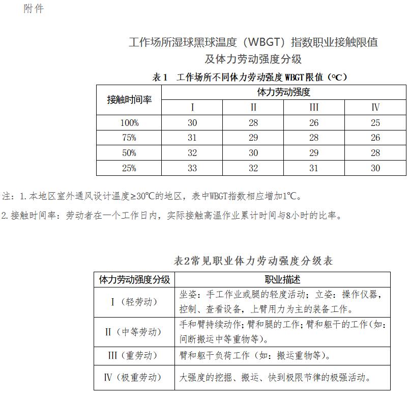 高溫作業(yè)是指在生產(chǎn)過程中,工作地點(diǎn)平均濕球黑球溫度(WBGT)指數(shù)超過規(guī)定職業(yè)接觸限值的作業(yè)(限值要求見附件)。