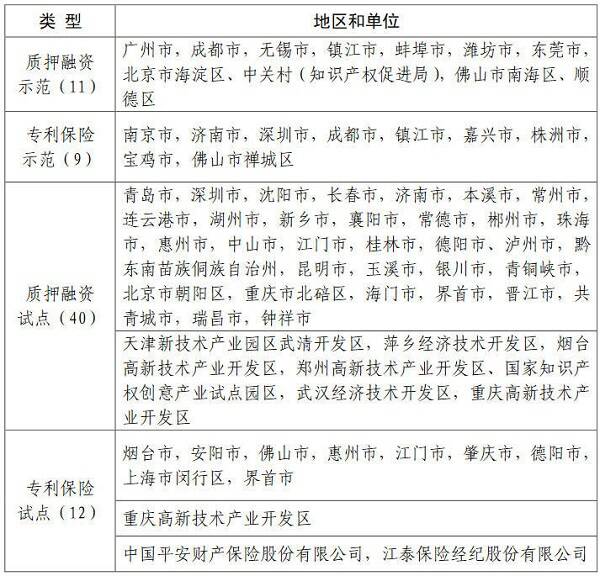 專利質(zhì)押融資及專利保險試點示范地區(qū)和單位名單