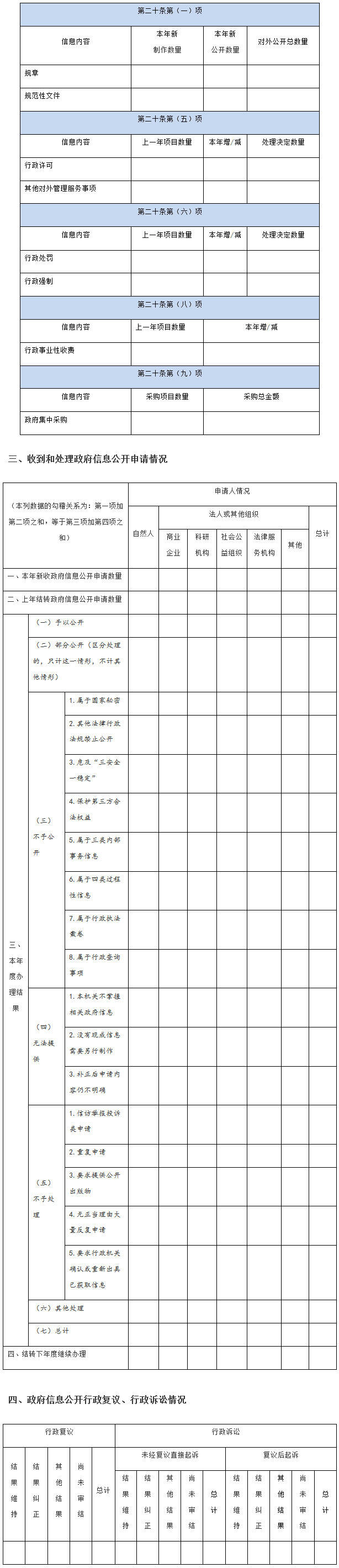 各行政機關(guān)政府信息公開工作年度報告格式模板附后。此前有關(guān)政府信息公開的各類報告和統(tǒng)計口徑,隨原政府信息公開條例的失效而失效。政府信息公開工作主管部門負(fù)責(zé)匯總的本級政府上一年度政府信息公開工作年度報告格式,參照這一格式模板辦理。黨的工作機關(guān)加掛行政機關(guān)牌子的單位,政府信息公開工作年度報告內(nèi)容依據(jù)全國政府信息公開工作主管部門發(fā)布的有關(guān)規(guī)定(國辦公開辦函〔2019〕51號)確定,并參照這一格式模板辦理。