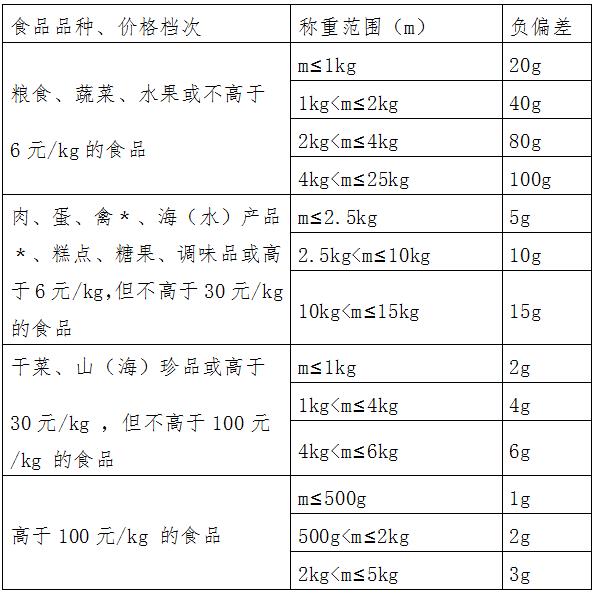 第五條 零售商品經(jīng)銷者使用稱重計(jì)量器具每次當(dāng)場稱重商品,在本辦法附表1、附表2稱重范圍內(nèi),經(jīng)核稱商品的實(shí)際重量值與結(jié)算重量值之差不得超過該表規(guī)定的負(fù)偏差。