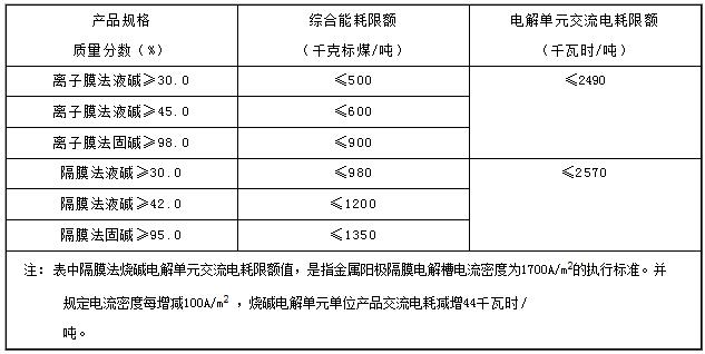 現(xiàn)有燒堿生產(chǎn)裝置單位產(chǎn)品能耗限額指標(biāo)包括綜合能耗和電解單元交流電耗,其限額值應(yīng)符合以下要求。