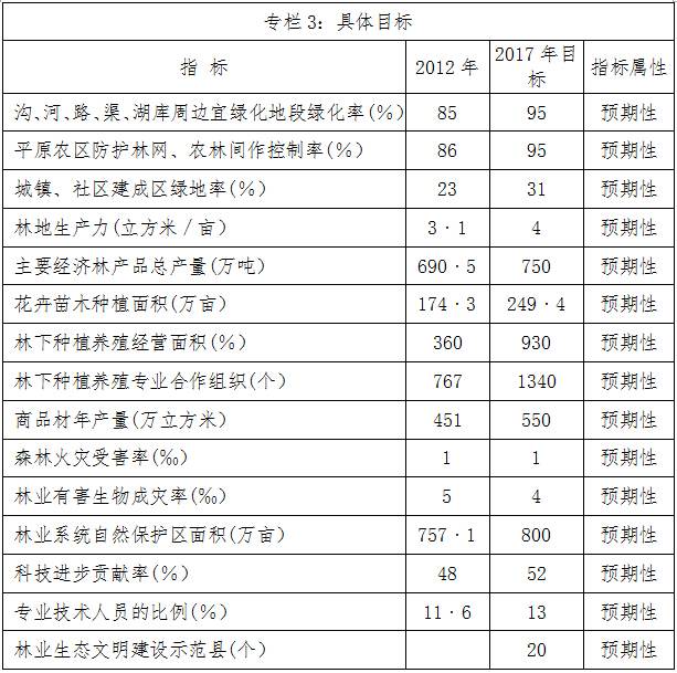 到2020年,全省森林面積達到6300萬畝,森林覆蓋率達到25%以上,森林蓄積量達到19500萬立方米以上,林業(yè)產(chǎn)業(yè)年總產(chǎn)值達到2300億元以上,形成銷售收入10億元以上的林業(yè)產(chǎn)業(yè)化集群75個,森林植被總碳儲量力爭達到11400萬噸以上,年林業(yè)生態(tài)效益價值達到6600億元以上,農(nóng)民來自林業(yè)的純收入平均達到1200元。