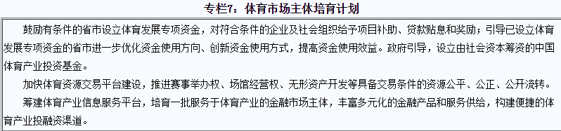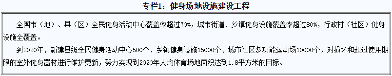 --體育產(chǎn)業(yè)規(guī)模和質(zhì)量不斷提升,體育消費水平明顯提高。到2020年,全國體育產(chǎn)業(yè)總規(guī)模超過3萬億元,體育產(chǎn)業(yè)增加值的年均增長速度明顯快于同期經(jīng)濟增長速度,在國內(nèi)生產(chǎn)總值中的比重達到1%,體育服務(wù)業(yè)增加值占比超過30%。體育消費額占人均居民可支配收入比例超過2.5%。