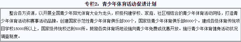 7.青少年體育促進計劃。指以廣泛開展青少年體育活動、普遍增強青少年體質(zhì)為目標(biāo)任務(wù),以活動、場地、組織建設(shè)為重點,統(tǒng)籌校內(nèi)外資源,建立和完善學(xué)校、社區(qū)、家庭相結(jié)合的青少年體育網(wǎng)絡(luò)和聯(lián)動機制,加強政府、社會、學(xué)校、家庭、市場等協(xié)同促進青少年體育發(fā)展。