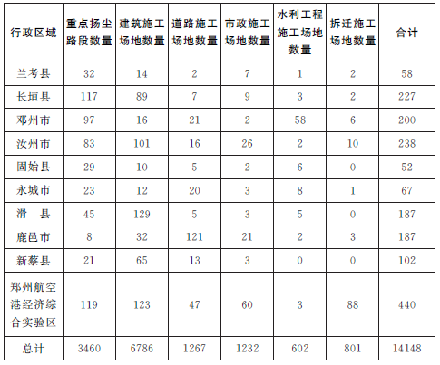 1.工作任務。針對全省各級、各部門排查上報的6786個建筑施工場地、1267個道路施工場地、1232個市政施工場地、801個拆遷施工場地、602個水利施工場地等總計10688個施工場地,以及各地進一步排查的所有施工工地,各省轄市、縣(市、區(qū))政府和住房城鄉(xiāng)建設(shè)、交通運輸、國土資源、水利、規(guī)劃等相關(guān)部門以及鄉(xiāng)鎮(zhèn)政府和街道辦事處,均要依據(jù)法定管理職責和權(quán)限,與主管領(lǐng)域或轄區(qū)內(nèi)施工單位簽訂揚塵污染治理責任書,監(jiān)督施工單位按照規(guī)定標準、治理措施和時限,完成各項治理目標任務。特別是對連霍高速河南段、京港澳高速河南段等改擴建高速區(qū)段和高鐵在建區(qū)段等大型道路建設(shè)施工工地,要實施重點監(jiān)督管理。