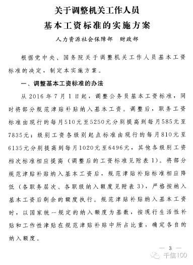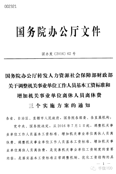 國(guó)辦發(fā)〔2016〕62號(hào)《國(guó)務(wù)院辦公廳轉(zhuǎn)發(fā)人社部財(cái)政部關(guān)于調(diào)整機(jī)關(guān)事業(yè)單位工作人員基本工資標(biāo)準(zhǔn)和增加機(jī)關(guān)事業(yè)單位離休人員離休費(fèi)三個(gè)實(shí)施方案通知》