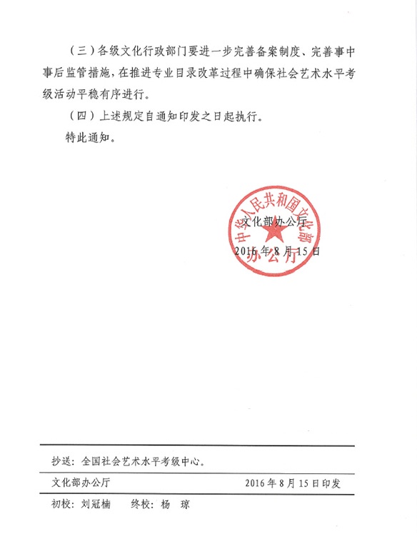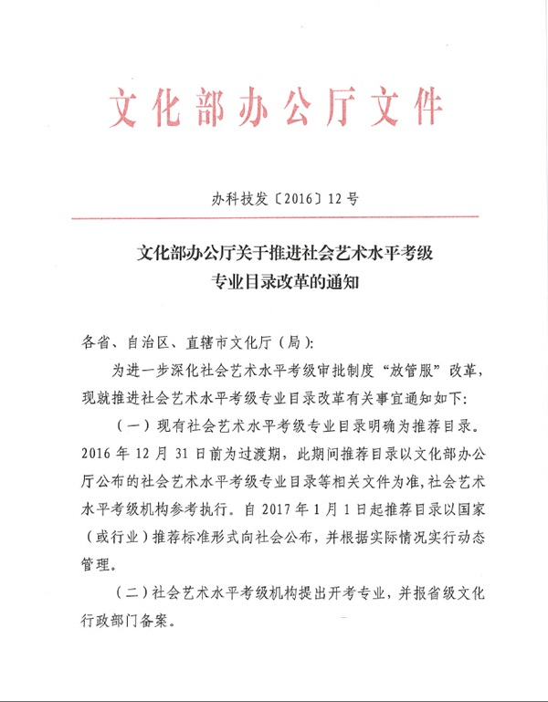 辦科技發(fā)〔2016〕12號《文化部辦公廳關(guān)于推進社會藝術(shù)水平考級專業(yè)目錄改革的通知》