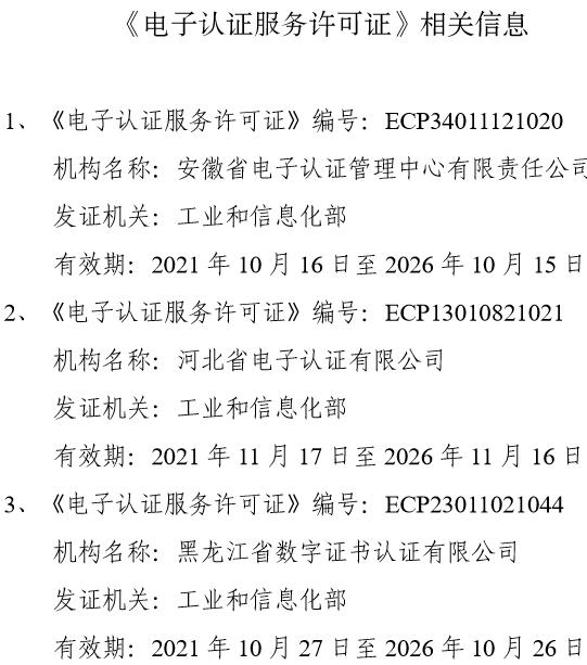 依據《中華人民共和國行政許可法》第五十條、《中華人民共和國電子簽名法》第二十五條、《電子認證服務管理辦法》第十條等規(guī)定,經審查,決定準予安徽省電子認證管理中心有限責任公司、河北省電子認證有限公司、黑龍江省數字證書認證有限公司等 3 家機構申請的電子認證服務許可延續(xù),《電子認證服務許可證》變更信息詳見附件。