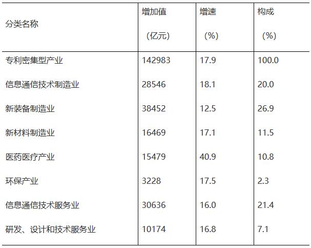 從內(nèi)部結(jié)構(gòu)看,新裝備制造業(yè)規(guī)模最大,增加值為38452億元,占專利密集型產(chǎn)業(yè)增加值的比重為26.9%;其次是信息通信技術(shù)服務(wù)業(yè),增加值為30636億元,所占比重為21.4%;再次是信息通信技術(shù)制造業(yè),增加值為28546億元,所占比重為20.0%;規(guī)模最小的是環(huán)保產(chǎn)業(yè),增加值為3228億元,所占比重為2.3%。