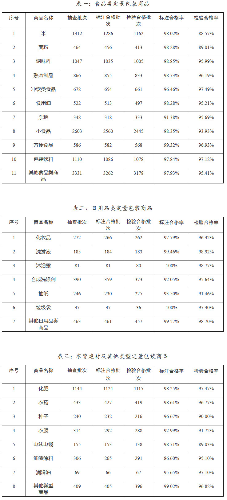 此次定量包裝商品凈含量計量監(jiān)督專項檢查在全國31個省、自治區(qū)、直轄市和新疆生產(chǎn)建設兵團部署開展,共抽查企業(yè)6037家,抽查食品類、日用品類、農(nóng)資建材類以及其他種類定量包裝商品共計17611批次,其中,凈含量標注合格17189批次,凈含量標注抽樣合格率為97.60%;凈含量檢驗合格16719批次,凈含量檢驗抽樣合格率為94.93%。