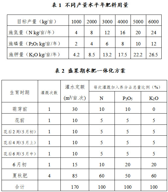 (4)施肥與優(yōu)質(zhì)栽培相結(jié)合。注意預(yù)防春季低溫凍害,夏季易出現(xiàn)澇害的平原地區(qū)注意結(jié)合起壟、覆膜或果園生草技術(shù),干旱地區(qū)提倡采用地表覆蓋和穴貯肥水技術(shù)。