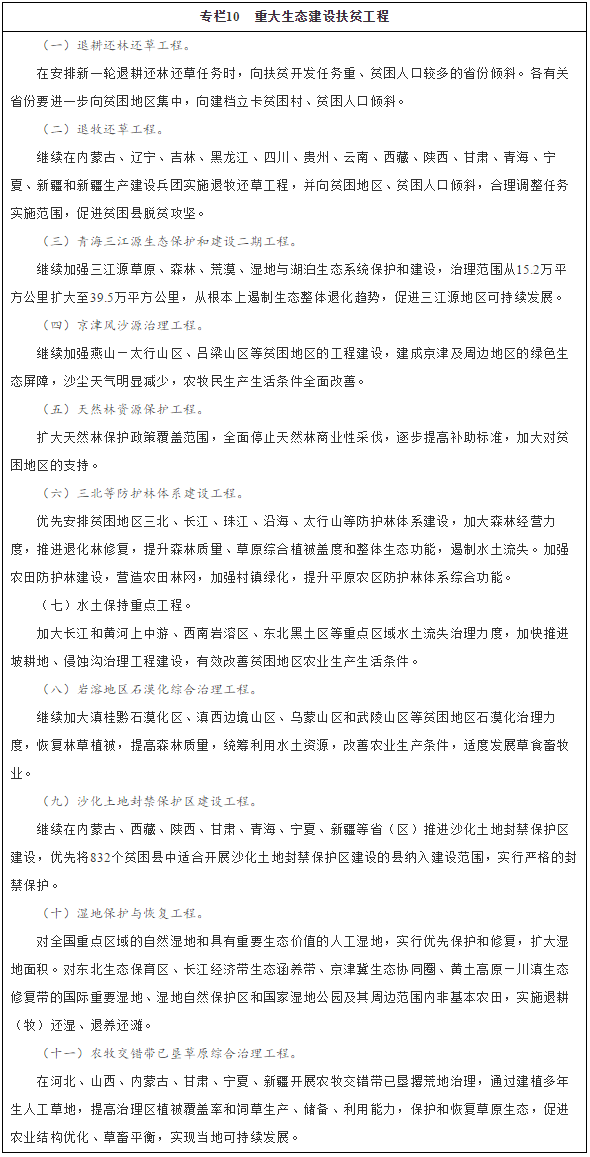 加強(qiáng)生態(tài)保護(hù)與建設(shè)。加快改善西南山區(qū)、西北黃土高原等水土流失狀況,加強(qiáng)林草植被保護(hù)與建設(shè)。加大三北等防護(hù)林體系建設(shè)工程、天然林資源保護(hù)、水土保持等重點(diǎn)工程實(shí)施力度。加大新一輪退耕還林還草工程實(shí)施力度,加強(qiáng)生態(tài)環(huán)境改善與扶貧協(xié)同推進(jìn)。在重點(diǎn)區(qū)域推進(jìn)京津風(fēng)沙源治理、巖溶地區(qū)石漠化治理、青海三江源保護(hù)等山水林田湖綜合治理工程,遏制牧區(qū)、農(nóng)牧結(jié)合貧困地區(qū)土壤沙化退化趨勢(shì),緩解土地荒漠化、石漠化,組織動(dòng)員貧困人口參與生態(tài)保護(hù)建設(shè)工程,提高貧困人口受益水平,結(jié)合國(guó)家重大生態(tài)工程建設(shè),因地制宜發(fā)展舍飼圈養(yǎng)和設(shè)施農(nóng)業(yè),大力發(fā)展具有經(jīng)濟(jì)效益的生態(tài)林業(yè)產(chǎn)業(yè)。