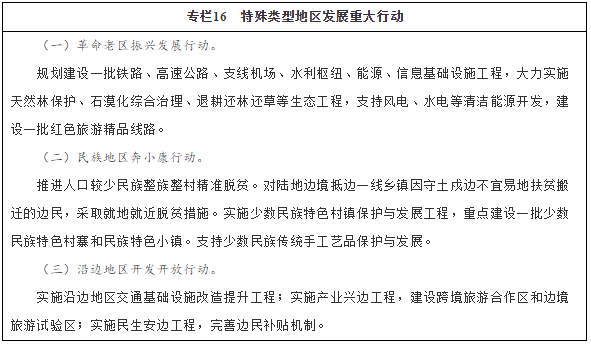大力推進(jìn)革命老區(qū)、民族地區(qū)、邊疆地區(qū)脫貧攻堅(jiān)。加大脫貧攻堅(jiān)力度,支持革命老區(qū)開(kāi)發(fā)建設(shè),推進(jìn)實(shí)施贛閩粵原中央蘇區(qū)、左右江、大別山、陜甘寧、川陜等重點(diǎn)貧困革命老區(qū)振興發(fā)展規(guī)劃,積極支持沂蒙、湘鄂贛、太行、海陸豐等欠發(fā)達(dá)革命老區(qū)加快發(fā)展。擴(kuò)大對(duì)革命老區(qū)的財(cái)政轉(zhuǎn)移支付規(guī)模。加快推進(jìn)民族地區(qū)重大基礎(chǔ)設(shè)施項(xiàng)目和民生工程建設(shè),實(shí)施少數(shù)民族特困地區(qū)和特困群體綜合扶貧工程,出臺(tái)人口較少民族整體脫貧的特殊政策措施。編制邊境扶貧專項(xiàng)規(guī)劃,采取差異化政策,加快推進(jìn)邊境地區(qū)基礎(chǔ)設(shè)施和社會(huì)保障設(shè)施建設(shè),集中改善邊民生產(chǎn)生活條件,扶持發(fā)展邊境貿(mào)易和特色經(jīng)濟(jì),大力推進(jìn)興邊富民行動(dòng),使邊民能夠安心生產(chǎn)生活、安心守邊固邊。加大對(duì)邊境地區(qū)的財(cái)政轉(zhuǎn)移支付力度,完善邊民補(bǔ)貼機(jī)制。加大中央投入力度,采取特殊扶持政策,推進(jìn)西藏、四省藏區(qū)和新疆南疆四地州脫貧攻堅(jiān)。