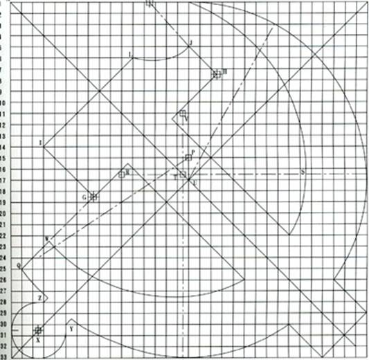 1 將一正方形分為32等分,分格線條編號為橫向1~33,豎向1′~33′。畫出對角線ac、bd。