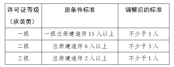 1. 對(duì)承裝類(lèi)承裝(修、試)電力設(shè)施許可證申請(qǐng)條件中要求的電力相關(guān)專(zhuān)業(yè)注冊(cè)建造師數(shù)量進(jìn)行如下調(diào)整:
