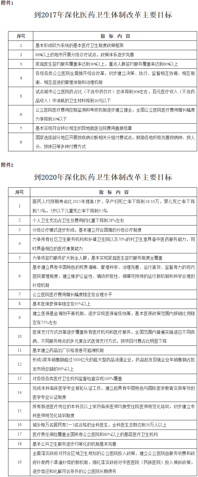 到2017年,基本形成較為系統(tǒng)的基本醫(yī)療衛(wèi)生制度政策框架。分級診療政策體系逐步完善,現(xiàn)代醫(yī)院管理制度和綜合監(jiān)管制度建設(shè)加快推進,全民醫(yī)療保障制度更加高效,藥品生產(chǎn)流通使用政策進一步健全。到2020年,普遍建立比較完善的公共衛(wèi)生服務體系和醫(yī)療服務體系、比較健全的醫(yī)療保障體系、比較規(guī)范的藥品供應保障體系和綜合監(jiān)管體系、比較科學的醫(yī)療衛(wèi)生機構(gòu)管理體制和運行機制。經(jīng)過持續(xù)努力,基本建立覆蓋城鄉(xiāng)居民的基本醫(yī)療衛(wèi)生制度,實現(xiàn)人人享有基本醫(yī)療衛(wèi)生服務,基本適應人民群眾多層次的醫(yī)療衛(wèi)生需求,我國居民人均預期壽命比2015年提高1歲,孕產(chǎn)婦死亡率下降到18/10萬,嬰兒死亡率下降到7.5‰,5歲以下兒童死亡率下降到9.5‰,主要健康指標居于中高收入國家前列,個人衛(wèi)生支出占衛(wèi)生總費用的比重下降到28%左右。