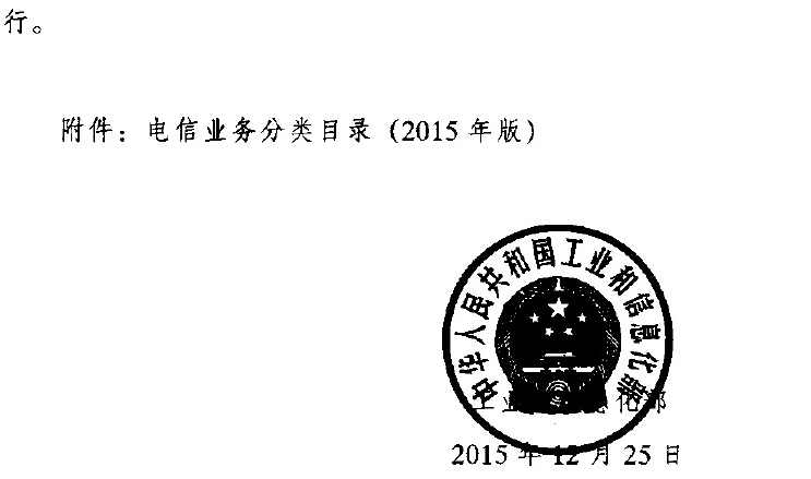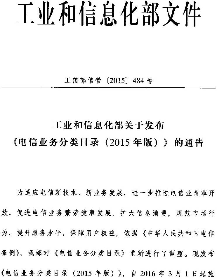 工信部信管〔2015〕484號 工業(yè)和信息化部關(guān)于發(fā)布《電信業(yè)務(wù)分類目錄(2015年版)》的通告