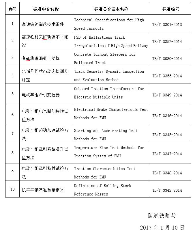 國鐵科法〔2017〕6號 國家鐵路局關(guān)于發(fā)布《高速鐵路道岔技術(shù)條件》等10項鐵道行業(yè)技術(shù)標(biāo)準(zhǔn)英文譯本的公告