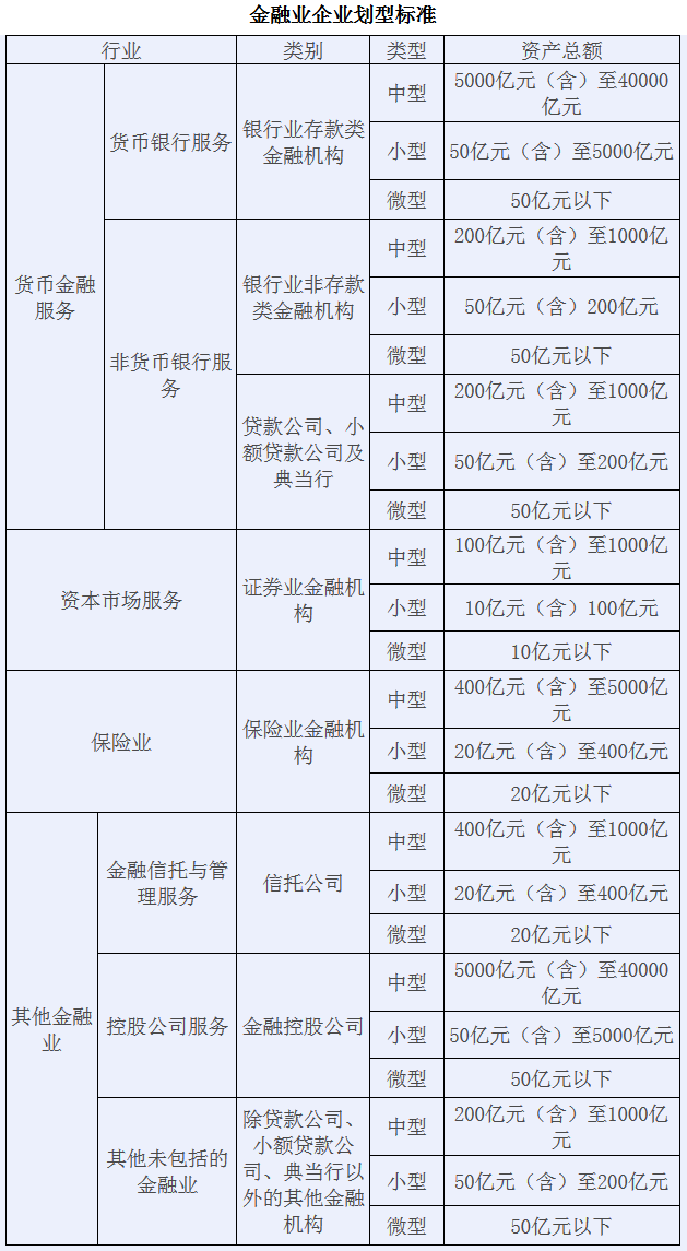(一)銀行業(yè)存款類金融機構。資產(chǎn)總額40000億元以下的為中小微型企業(yè)。其中,資產(chǎn)總額5000億元及以上的為中型企業(yè),資產(chǎn)總額50億元及以上的為小型企業(yè),資產(chǎn)總額50億元以下的為微型企業(yè)。