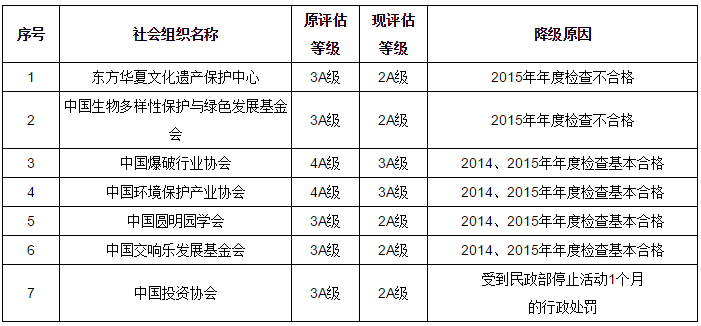 根據(jù)《社會(huì)組織評(píng)估管理辦法》第三十條關(guān)于獲得評(píng)估等級(jí)的社會(huì)組織有上年度年度檢查不合格、連續(xù)2年年度檢查基本合格或受相關(guān)政府部門(mén)行政處罰情形的,由民政部門(mén)作出降低評(píng)估等級(jí)處理的規(guī)定,決定對(duì)東方華夏文化遺產(chǎn)保護(hù)中心、中國(guó)生物多樣性保護(hù)與綠色發(fā)展基金會(huì)、中國(guó)爆破行業(yè)協(xié)會(huì)、中國(guó)環(huán)境保護(hù)產(chǎn)業(yè)協(xié)會(huì)、中國(guó)圓明園學(xué)會(huì)、中國(guó)交響樂(lè)發(fā)展基金會(huì)、中國(guó)投資協(xié)會(huì)等7家社會(huì)組織降低評(píng)估等級(jí)。