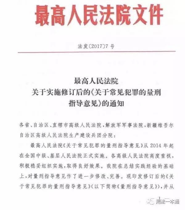 法發(fā)〔2017〕7號(hào)《最高人民法院關(guān)于實(shí)施修訂后的〈關(guān)于常見(jiàn)犯罪量刑指導(dǎo)意見(jiàn)〉的通知》