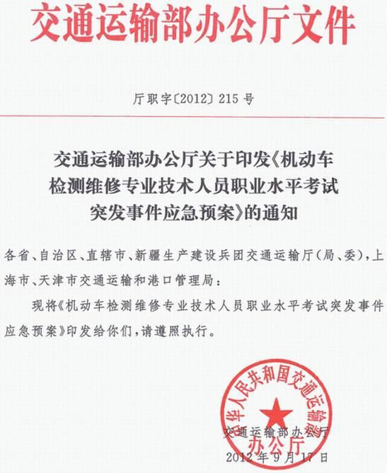 廳職字〔2012〕215號(hào) 交通運(yùn)輸部辦公廳關(guān)于印發(fā)《機(jī)動(dòng)車(chē)檢測(cè)維修專(zhuān)業(yè)技術(shù)人員職業(yè)水平考試突發(fā)事件應(yīng)急預(yù)案》的通知