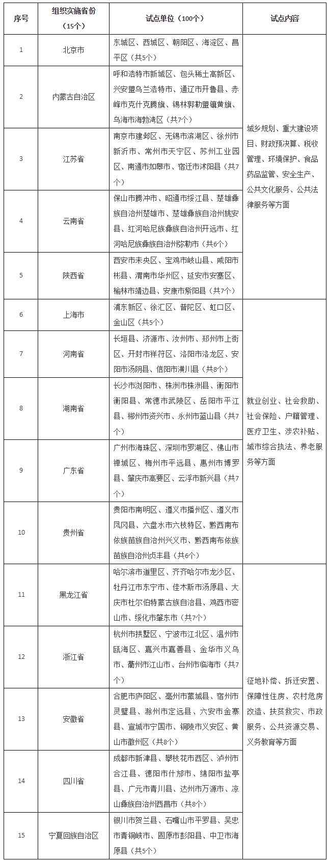 根據(jù)各地區(qū)實際情況和政務(wù)公開工作基礎(chǔ),確定在北京市、安徽省、陜西省等15個?。▍^(qū)、市)的100個縣(市、區(qū))(以下稱試點單位),重點圍繞城鄉(xiāng)規(guī)劃、重大建設(shè)項目、公共資源交易、財政預(yù)決算、安全生產(chǎn)、稅收管理、征地補償、拆遷安置、保障性住房、農(nóng)村危房改造、環(huán)境保護(hù)、公共文化服務(wù)、公共法律服務(wù)、扶貧救災(zāi)、食品藥品監(jiān)管、城市綜合執(zhí)法、就業(yè)創(chuàng)業(yè)、社會保險、社會救助、養(yǎng)老服務(wù)、戶籍管理、涉農(nóng)補貼、義務(wù)教育、醫(yī)療衛(wèi)生、市政服務(wù)等方面開展試點工作(《試點單位及試點內(nèi)容表》附后)。承擔(dān)試點任務(wù)的省(區(qū)、市)在做好試點工作的同時,可以結(jié)合實際適當(dāng)增加試點內(nèi)容。