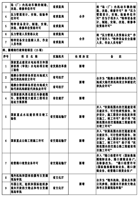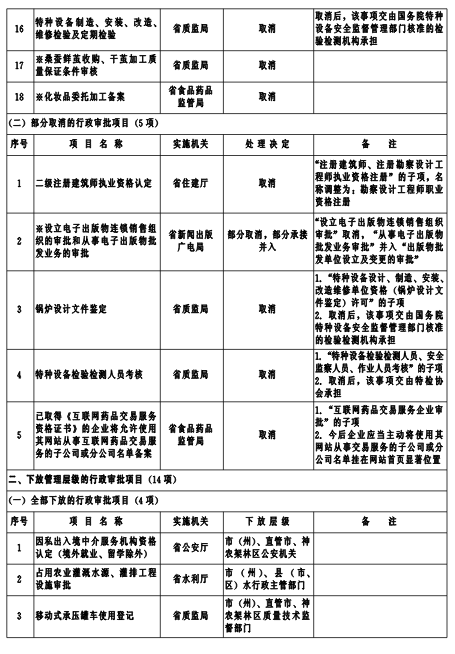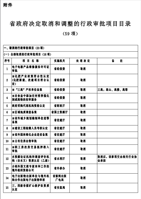 為深入貫徹落實黨的十八大和十八屆三中、四中全會關于簡政放權、深化行政審批制度改革的要求,經審核論證,省人民政府決定再取消、調整行政審批項目59項(包括非行政許可審批項目12項)。其中,全部取消18項、部分取消5項、全部下放4項、部分下放10項、合并7項、新增15項。