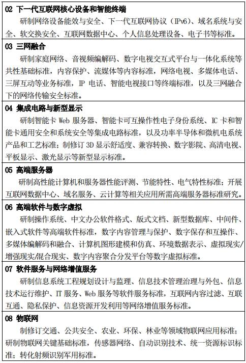 加強信息網(wǎng)絡(luò)基礎(chǔ)設(shè)施、新一代移動通信、下一代互聯(lián)網(wǎng)核心設(shè)備和智能終端、三網(wǎng)融合、物聯(lián)網(wǎng)、云計算、集成電路、新型顯示、高端軟件、高端服務(wù)器、軟件服務(wù)與網(wǎng)絡(luò)增值服務(wù)、數(shù)字虛擬等領(lǐng)域的標(biāo)準(zhǔn)化工作,開展10個高新技術(shù)標(biāo)準(zhǔn)化試點示范建設(shè),形成傳感器網(wǎng)絡(luò)、射頻識別、云計算、新型顯示、信息安全、軟件服務(wù)等具有自主技術(shù)的10大重要標(biāo)準(zhǔn)體系,支撐物聯(lián)網(wǎng)產(chǎn)業(yè)試點示范、三網(wǎng)融合試點等重點工程的實施,促進新一代信息技術(shù)產(chǎn)業(yè)的發(fā)展。