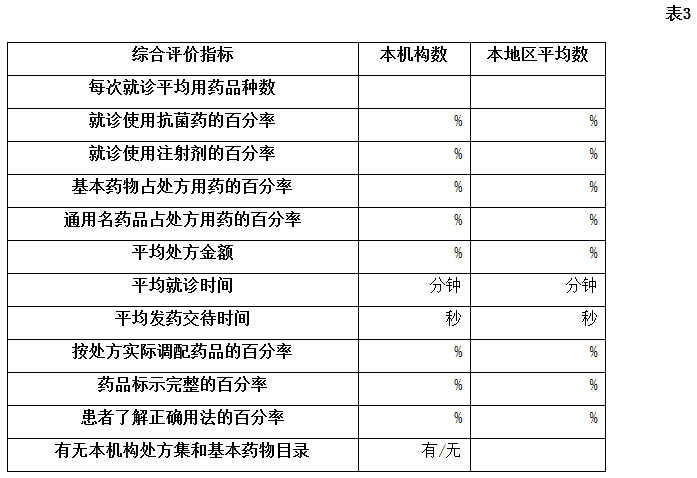 5.表3中“本地區(qū)平均數(shù)”是指本地市或者本省醫(yī)療機(jī)構(gòu)各項(xiàng)指標(biāo)的平均值,計(jì)算方法為:隨機(jī)抽取本地區(qū)10—20家醫(yī)院,處方總量不少于600例(張)的平均值,即抽取10家醫(yī)院時(shí),每家醫(yī)院隨機(jī)抽取不少于60例(張)處方,抽取20家醫(yī)院時(shí),每家醫(yī)院隨機(jī)抽取不少于30例(張)處方。“意見”欄由醫(yī)療機(jī)構(gòu)藥事管理委員會或者衛(wèi)生行政部門組織的藥學(xué)專家,根據(jù)各項(xiàng)評價(jià)指標(biāo)對醫(yī)療機(jī)構(gòu)藥事管理或者醫(yī)師處方情況提出意見、建議,某項(xiàng)指標(biāo)嚴(yán)重超常時(shí),應(yīng)當(dāng)提出預(yù)警信息。
