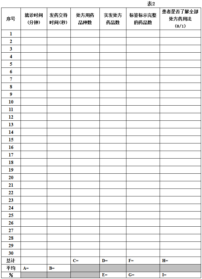 4.填寫表2時(shí),可以從門診取藥患者中隨機(jī)選取30位,由調(diào)查人員現(xiàn)場填寫。