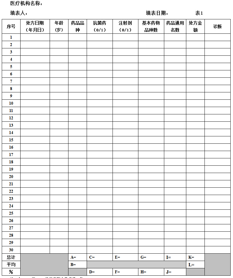 3.表1中“藥品品種”、“抗菌藥(0/1)”、“注射劑(0/1)”、“基本藥物品種數(shù)”“藥品通用名數(shù)”、“處方金額”均為每張?zhí)幏降臄?shù)據(jù),其中,“基本藥物品種數(shù)”為國家或者本省基本藥物目錄中的藥物品種。
