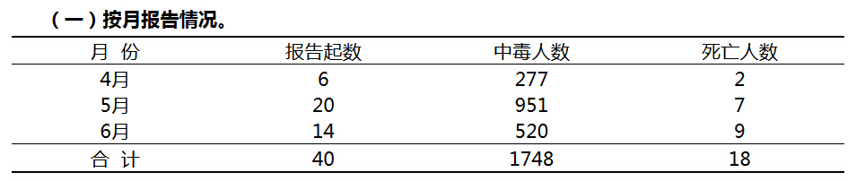 第二季度,5月份報(bào)告的事件起數(shù)和中毒人數(shù)最多,分別占第二季度總報(bào)告起數(shù)和中毒總?cè)藬?shù)的50.0%和54.4%。6月份報(bào)告的死亡人數(shù)最多,占第二季度死亡總?cè)藬?shù)的50%。