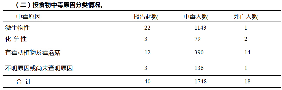 (一)按食物中毒發(fā)生原因分析,第二季度,微生物性食物中毒事件的事件報(bào)告起數(shù)和中毒人數(shù)最多,主要致病因子為沙門(mén)氏菌、蠟樣芽胞桿菌及副溶血性弧菌。有毒動(dòng)植物及毒蘑菇引起的食物中毒事件死亡人數(shù)最多,主要致病因子為毒蘑菇、未煮熟四季豆、生番茄及野菜。化學(xué)性食物中毒事件主要致病因子為亞硝酸鹽和毒鼠強(qiáng)。