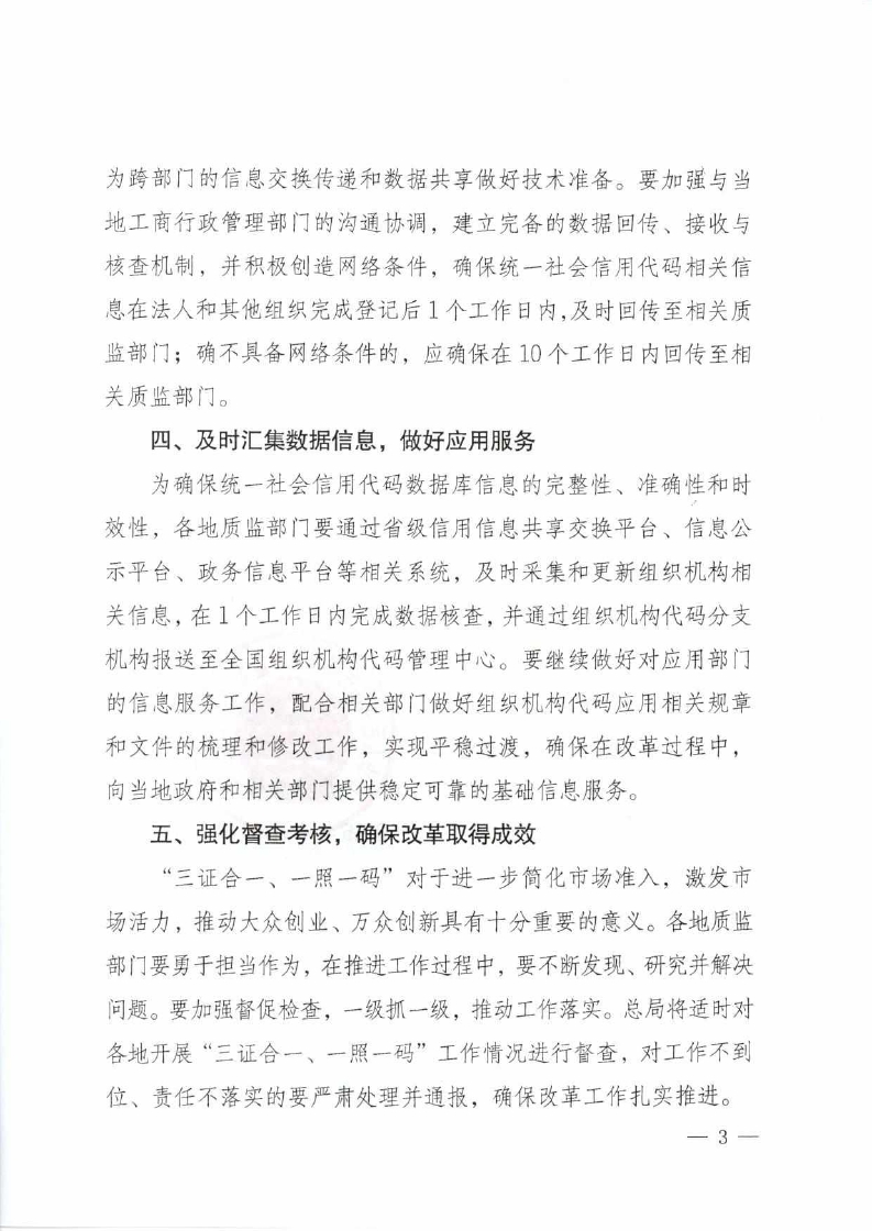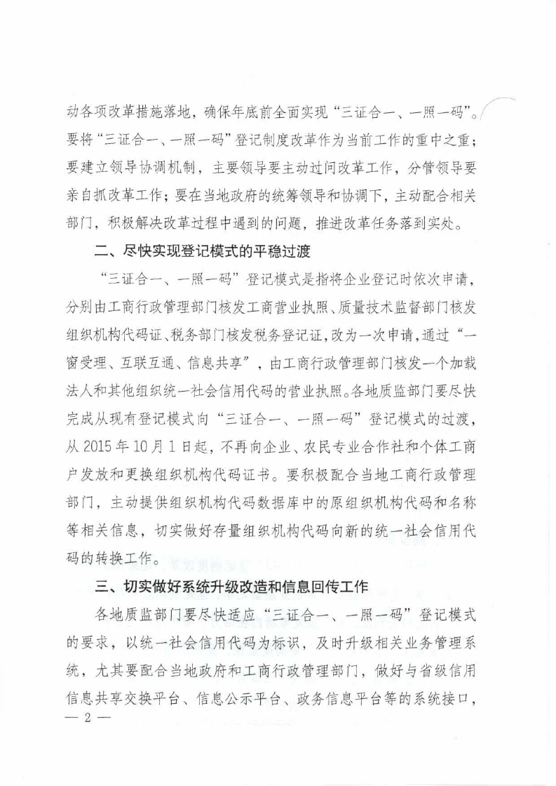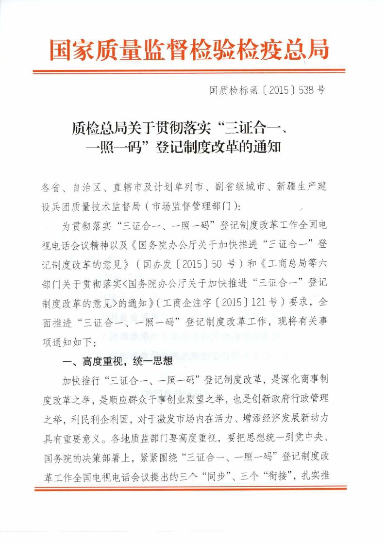 國質(zhì)檢標(biāo)函〔2015〕538號《質(zhì)檢總局關(guān)于貫徹落實“三證合一、一照一碼”登記制度改革的通知》