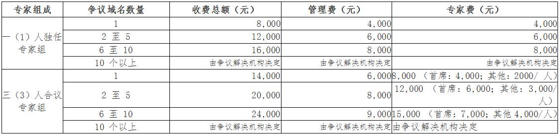 (四)案件程序費(fèi)用應(yīng)當(dāng)全部由投訴人承擔(dān)。在投訴人選擇一(1)人專家組,而被投訴人選擇三(3)人專家組的情況下,案件程序費(fèi)用由投訴人和被投訴人等額承擔(dān)。