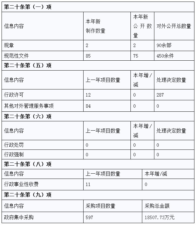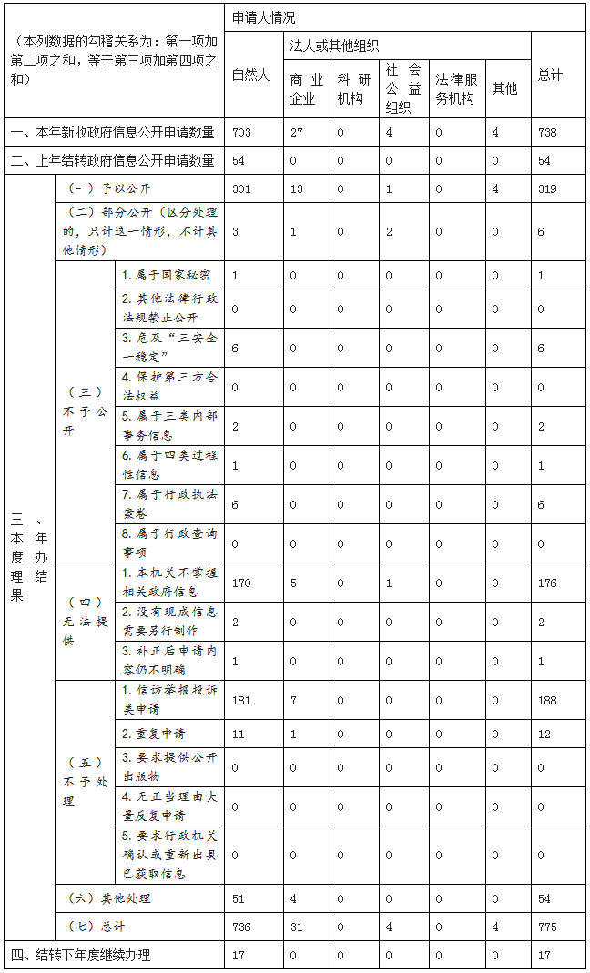 根據(jù)《中華人民共和國(guó)政府信息公開(kāi)條例》(國(guó)務(wù)院令第711號(hào))有關(guān)規(guī)定,編制本年度報(bào)告。本報(bào)告由總體情況、主動(dòng)公開(kāi)政府信息情況、收到和處理政府信息公開(kāi)申請(qǐng)情況、因政府信息公開(kāi)工作被申請(qǐng)行政復(fù)議和提起行政訴訟情況、工作中存在的主要問(wèn)題和改進(jìn)情況、其他需要報(bào)告的事項(xiàng)等內(nèi)容組成。本報(bào)告中所列數(shù)據(jù)的統(tǒng)計(jì)期限自2020年1月1日起至12月31日止。