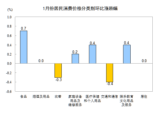 1月份,非食品價格環(huán)比持平。其中,醫(yī)療保健和個人用品、娛樂教育文化用品及服務(wù)、家庭設(shè)備用品及維修服務(wù)價格分別上漲0.4%、0.4%和0.2%;煙酒及用品、居住價格持平;交通和通信、衣著價格分別下降0.4%和0.3%。