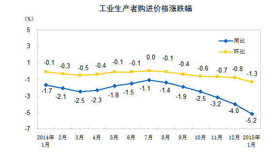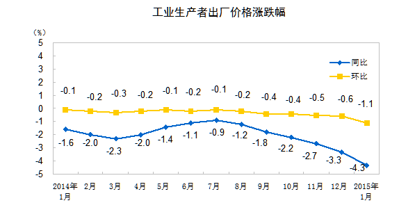 2015年1月份,全國(guó)工業(yè)生產(chǎn)者出廠價(jià)格同比下降4.3%,環(huán)比下降1.1%。工業(yè)生產(chǎn)者購(gòu)進(jìn)價(jià)格同比下降5.2%,環(huán)比下降1.3%。