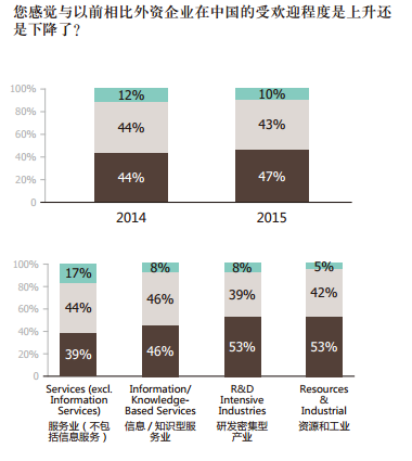 去年中國出臺的一系列開放服務(wù)業(yè)的舉措似乎影響了服務(wù)業(yè)業(yè)內(nèi)的總體感受,但很多企業(yè)依然感覺與以前相比受歡迎程度下降。資源和工業(yè)企業(yè)和研發(fā)密集型行業(yè)感覺自己最不受歡迎,這兩個行業(yè)內(nèi)的大部分(53%)的受訪者表示與以前相比受歡迎程度下降。