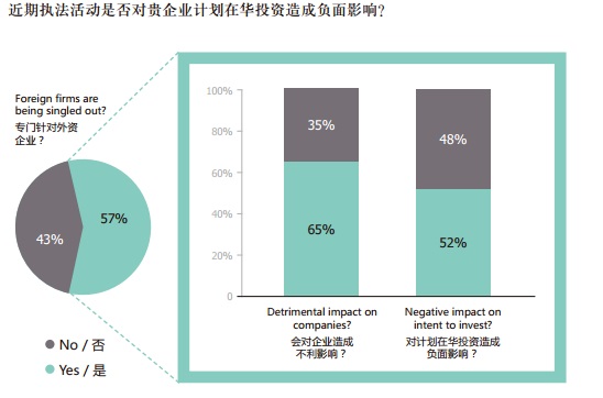 與此同時,大多數(shù)受訪企業(yè)認(rèn)為執(zhí)法活動專門針對和打擊外資企業(yè)。其中大部分受訪會員企業(yè)表示近期的執(zhí)法活動針對的主體正是外資企業(yè),其中 65% 擔(dān)心上述執(zhí)法活動會對所在企業(yè)造成不利影響,52% 認(rèn)為上述執(zhí)法活動會抑制他們的在華投資意愿。