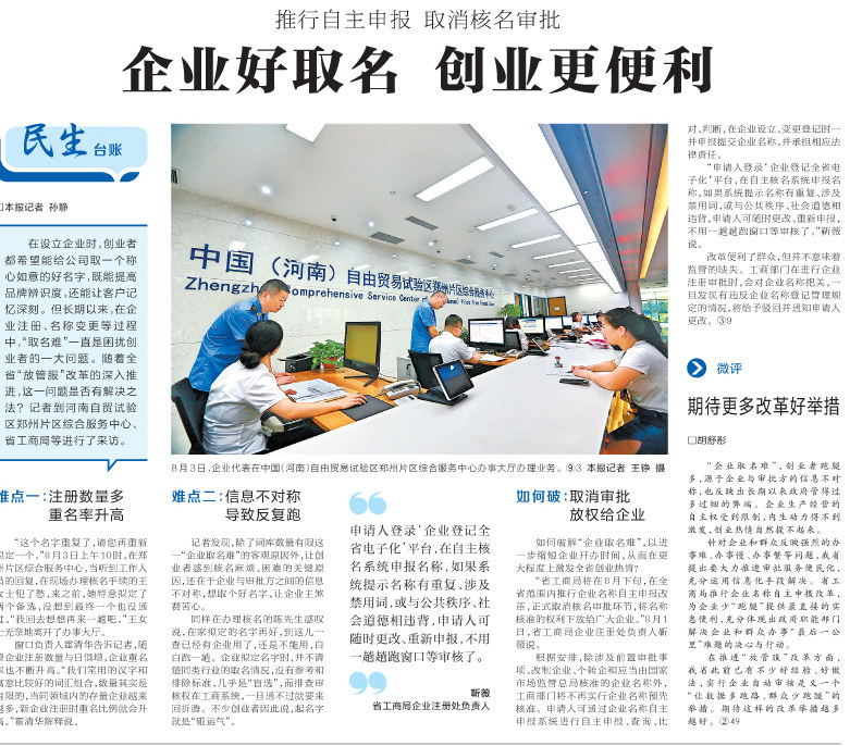 《河南日報》:企業(yè)好取名創(chuàng)業(yè)更便利 取消審批放權給企業(yè)