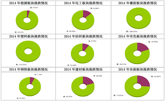 2014 年,據(jù)生意社監(jiān)測的八大行業(yè)中,其中,能源行業(yè)環(huán)比上升的商品共1種,上漲的為石油焦(2.88%),均漲跌幅為-21.69%;化工行業(yè)環(huán)比上升的商品 共15種,其中漲幅5%以上的商品共9種,占該板塊被監(jiān)測商品數(shù)的7.9%,均漲跌幅為-14.47%;橡塑行業(yè)上漲的商品共0種,下跌的商品共6種,均 漲跌幅為-18.02%;紡織行業(yè)環(huán)比上升的商品共2種,其中漲幅5%以上的商品共2種,占該板塊被監(jiān)測商品數(shù)的9.5%,漲跌幅為-12.51%。