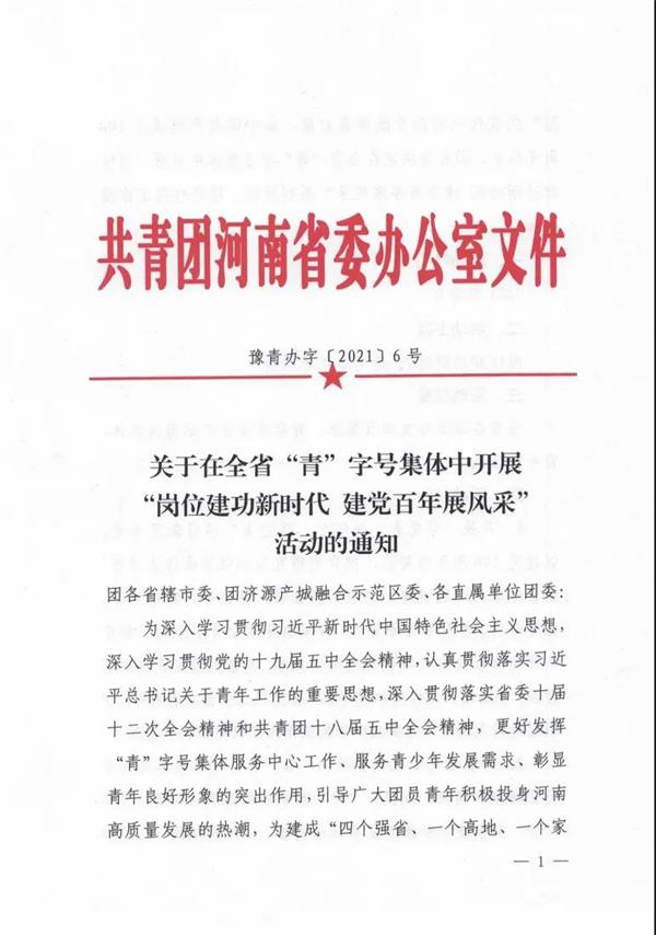 豫青辦字〔2021〕6號(hào)《共青團(tuán)河南省委辦公室關(guān)于在全省“青”字號(hào)集體中開展“崗位建功新時(shí)代建黨百年展風(fēng)采”活動(dòng)的通知》