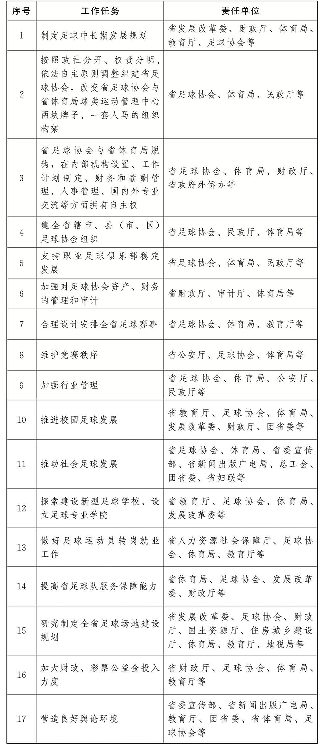 (十七)努力打造高水平省足球隊(duì)。建立與足球俱樂(lè)部協(xié)調(diào)機(jī)制,努力形成省足球隊(duì)與俱樂(lè)部在人員使用、集訓(xùn)參賽、聯(lián)合培養(yǎng)、資源共享等方面的新模式。建立足球人才數(shù)據(jù)庫(kù),對(duì)高水平青少年球員長(zhǎng)期跟蹤、重點(diǎn)培養(yǎng),創(chuàng)新人才培養(yǎng)、發(fā)現(xiàn)和選拔機(jī)制。提高保障水平,改善訓(xùn)練條件,改進(jìn)管理方式,力爭(zhēng)我省男足、女足球隊(duì)在全國(guó)綜合性運(yùn)動(dòng)會(huì)上進(jìn)入先進(jìn)行列。