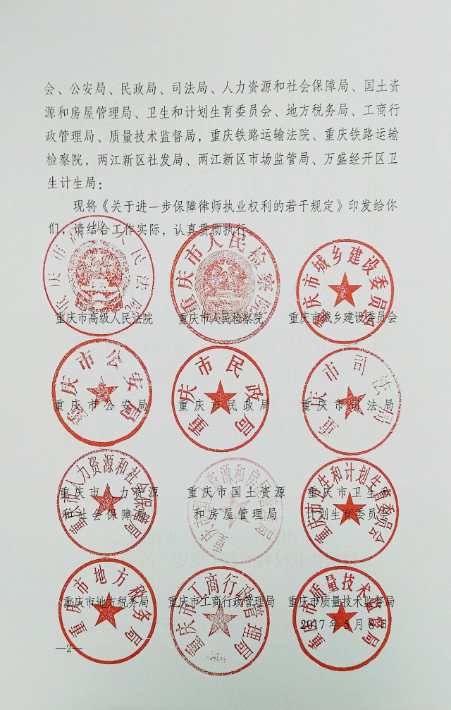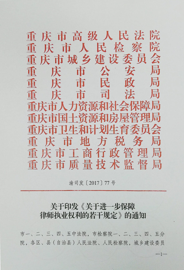 渝司發(fā)〔2017〕77號《重慶市高級人民法院等12部門關(guān)于進(jìn)一步保障律師執(zhí)業(yè)權(quán)利的若干規(guī)定》